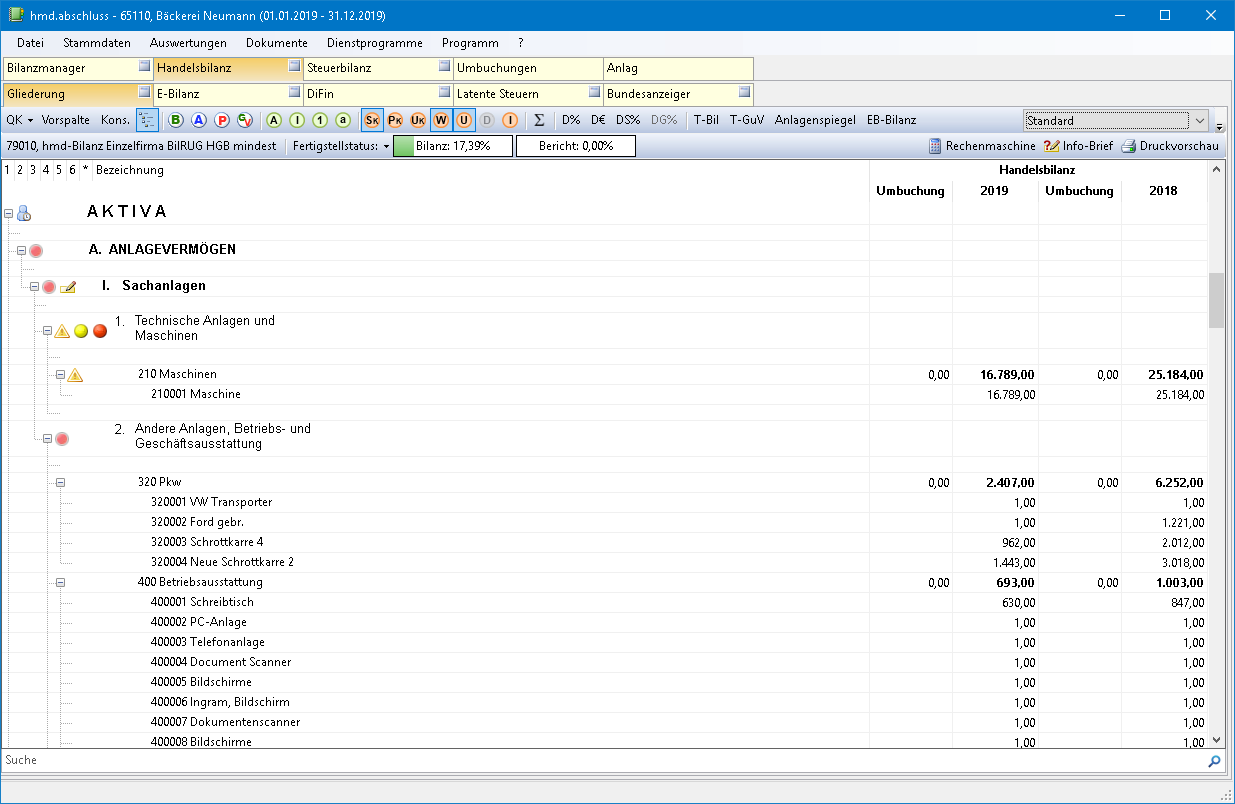 Heute, Jahrzehnte später, haben wir alles, was dem Sachbearbeiter Vorteile und Zeitersparnis in der Bearbeitung bringt, wieder in den hmd.abschluss bei der Bilanz am Bildschirm eingebaut. Fangen wir mit der einfachen, aber informativsten Anzeige an. Klicken Sie auf „Handels- oder Steuerbilanz“ und Sie erhalten sofort die gewünschte Anzeige. Und zwar in jeder Ansichtsform. Detailliert mit Konten, Wirtschaftsgütern, Umbuchungen oder gerafft als Anzeige zur Veröffentlichung. Oder Handels- und Steuerbilanz nebeneinander, inklusive der Abweichungen.