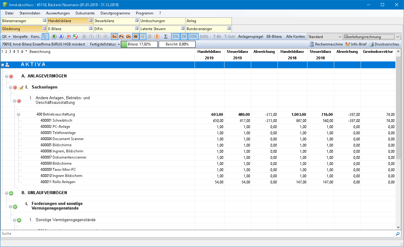 Im hmd.abschluss stellen wir Unternehmen beide Versionen einfach und komfortabel zur Verfügung. Sie rufen die Überleitungsrechnung per Mausklick direkt aus der Handelsbilanz auf. Alle relevanten Werte werden sofort eingelesen und nach der Gliederung der Firma dargestellt. Der vertikale Aufbau der Gliederung erfolgt im Detail nach der Bilanzposition, dem Konto, dem Wirtschaftsgut, sofern ein Anlagekonto angesprochen ist, bzw. nach der entsprechenden Umbuchung, die für ein Konto oder Gegenkonto durchgeführt wurde.